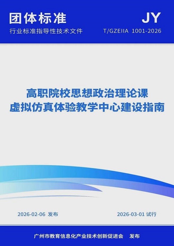 2月6日,《高职院校思想政治理论课虚拟仿真体验教学中心建设指南》(JY T/GZEIIA 1001-2026)由广州市教育信息化产业技术创新促进会正式发布,将于3月1日起试行,为全国高职院校思政课虚拟仿真体验教学中心建设提供标准化、实操性指导框架。